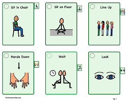 ASD students in the classroom: I had a kindergartner who was on the spectrum and often created disruptions that made class difficult to teach and learn in. His classroom teacher gave me a set of picture cards to use. The student could not process a long stream of words and therefore had a difficult time following directions. With the picture cards below, I was able to run the class more smoothly just by showing him instructions instead of telling him.