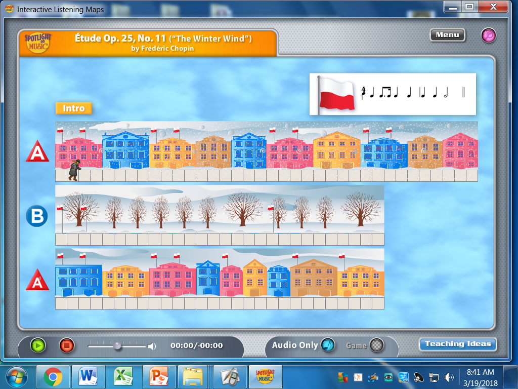 My students have multiple means of representation in each activity of every lesson. Many of our lessons get transferred to instruments. To be successful with this it is important to set the students up. Body percussion is a great form of kinesthetic learning that prepares the students for instruments. When using xylophones, we usually begin with bilaterally patting our legs to make the bilateral motion of playing two notes at once with mallets. When transferring to drums, we often use alternating hand movements so when the drums come out, students know to alternate hands. I represent content visually with flip charts on the Promethean board or with listening maps. The listening maps are a good way to have visual and aural learning. Many of our listening maps are interactive and students are able to visually see the sound they are hearing. The first example below is a listening map of Beethoven's 5th Symphony, an activity done in the fourth grade class to prepare them for their trip to the symphony. The second listening map is of Chopin's "The Winter Wind" and shows a person walking through the form ABA. The Polish flags show up every time the rhythm presented in the upper right corner is heard. My students were able to predict this even before I played the listening map.