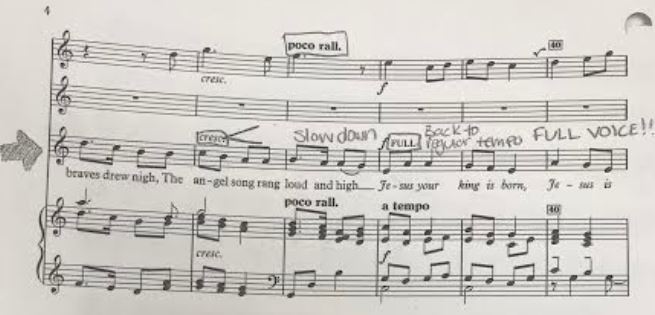 The transition from elementary school to middle school for 6th graders was a shock when it comes to choir class. The students were familiar with solfege when entering middle school but had never had to follow a voice part while the instrumental part was displayed. This realization brought me to prepare the music for the 6th graders differently than for the 7th and 8th graders. Below is an example of how I marked the music before handing it out to the students. I placed an arrow next to the voice line for every system on every page. I made sure to translate all of the Italian words into English on the voice line so when they read the music, their eyes could stay on one line.