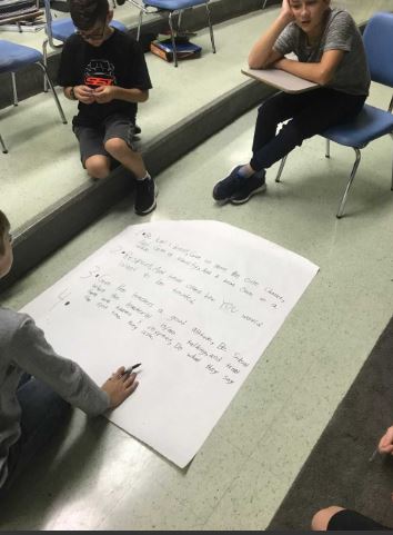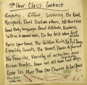 When we felt the boys were breaking the contract there were four questions that would be asked. What are you doing? What are you supposed to be doing? Are you doing it? What are you going to do about it? This was a moment for the boys to check themselves and think about their actions in class. If one student felt another student was breaking the contract he would give the other student a two-handed stop symbol. If the behavior did not stop, the boy would raise his hand and say "I need help." This created a safe and trusting environment where the students can handle problems themselves. Every day as the students walked through the door, I would shake their hands, look them in the eye, and ask them how their day was going. It was strange for them at first but by the end of the semester, the boys had their hands ready for a handshake before they walked in the class.